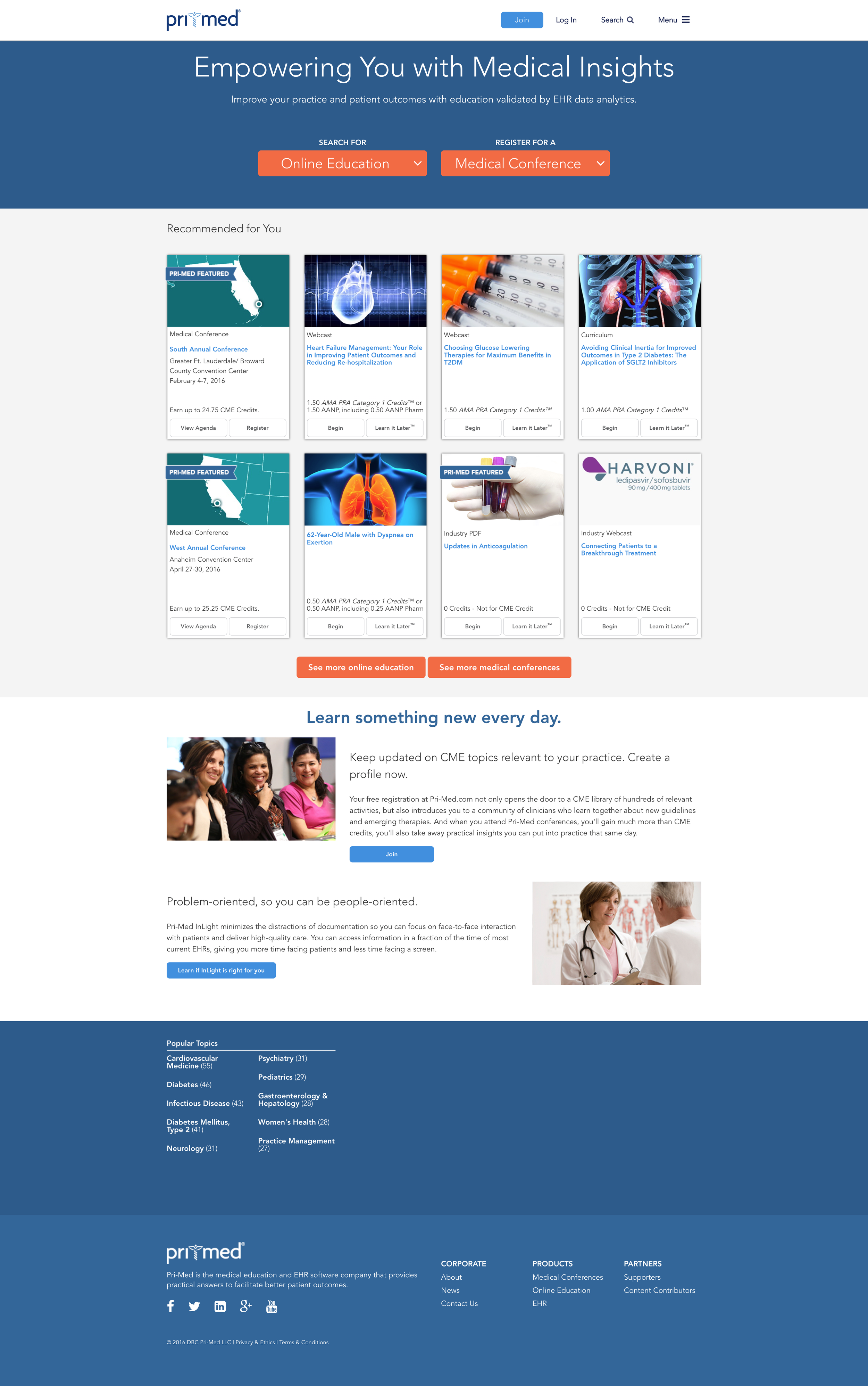 Virtual Education Seminars: With the guidance of a talented Digital Product team, Pri-Med launched live, online virtual education seminars. It’s no small feat getting busy doctors to tune in to an online broadcast, but we successfully hit attendance goals and set Pri-Med on the path to becoming a major leader in virtual continuing medical education.
